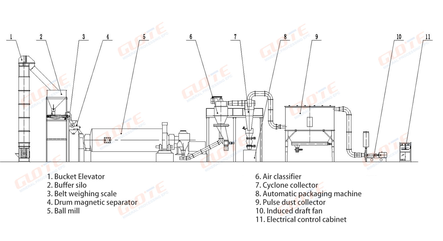 [Production line advantages]: This production line is an organic combination of high-purity sand grinder crushing technology, ball mill grinding technology, and airflow classification technology, which can give full play to their respective technical advantages.