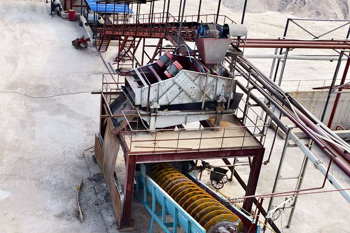 Scrubbing and desludging: The material enters the vibrating screen for screening through the feeder via a belt (with a weighing scale). The screened material enters the spiral ore washer for preliminary washing and desludging. After pre-washing, the material enters the scrubbing machine for secondary scrubbing. The scrubbed slurry enters the desludging bucket on the grading tower through the slurry pump to separate the sand, mud and impurities of the material, reduce the mud content of the original ore and balance the slurry.