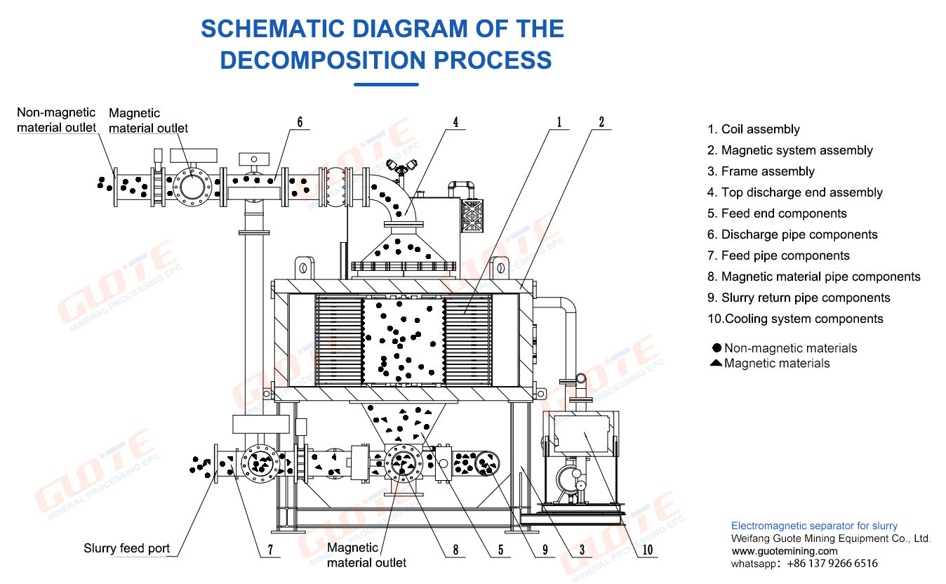 The excitation coil of the electromagnetic slurry high gradient magnetic separator is cooled by fully sealed cooling oil. The external high-efficiency heat exchanger performs oil-water heat exchange to achieve oil-water composite cooling, fast cooling speed, low temperature rise, and stable magnetic field.