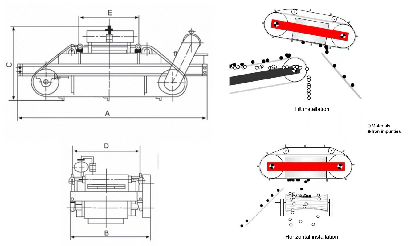 Working principle: When working, the excitation coil is energized to generate a high-intensity magnetic field, which absorbs ferromagnetic impurities in the material on the conveyor belt. At the same time, the oil pump extracts high-temperature transformer oil (after absorbing the heat of the coil) to the oil-water cooling system for heat exchange with the cooling water; the cooled oil flows back to the shell through the bottom to form a closed loop. This process ensures that the coil operates at a constant temperature and maintains a stable excitation current. The adsorbed iron parts are automatically unloaded through the waist drum-shaped roller, and its deviation correction design prevents the belt from running off. The entire process does not require external air intervention, completely isolating the risk of dust pollution.