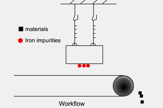 Working principle:When the material passes under the iron remover, the ferromagnetic impurities are adsorbed to the surface of the magnet by the strong magnetic field generated by the NdFeB, and the non-magnetic material continues to be transported. The cleaning method is manual intervention: regularly use a non-magnetic scraper or wear gloves to remove adsorbed iron impurities (suitable for scenarios with low iron content).