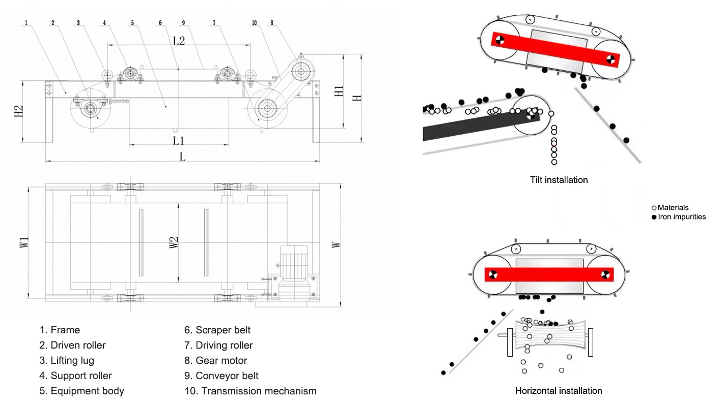 Model | Beit Width(mm) | Hanging Height(h≤mm) | Magnetic Strengh(≥mT) | Material Thickness (≤mm) | Driving Power(≤KW) | Belt speed(≤m/s) | Weight(KG) | Overall Dimension(mm) |