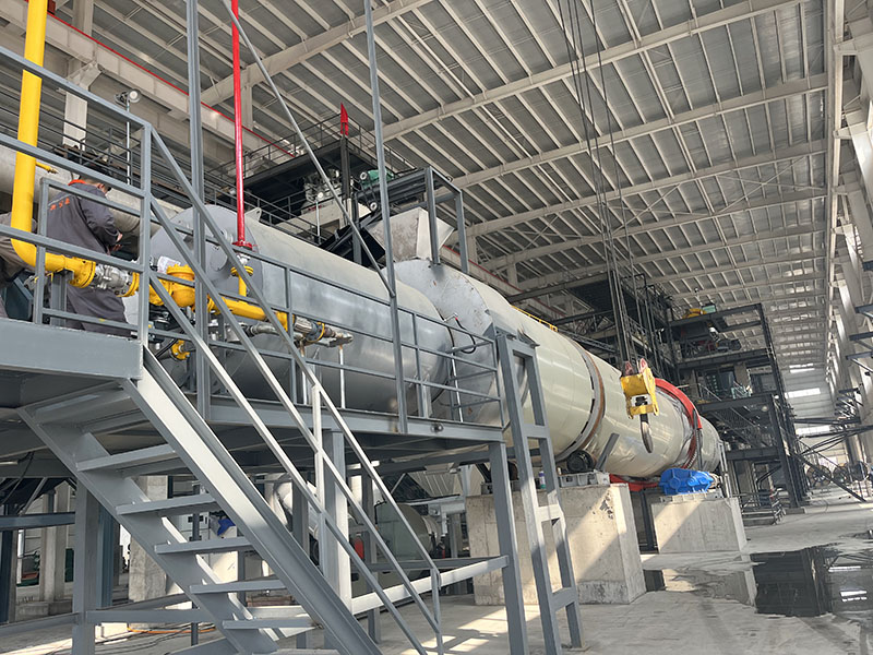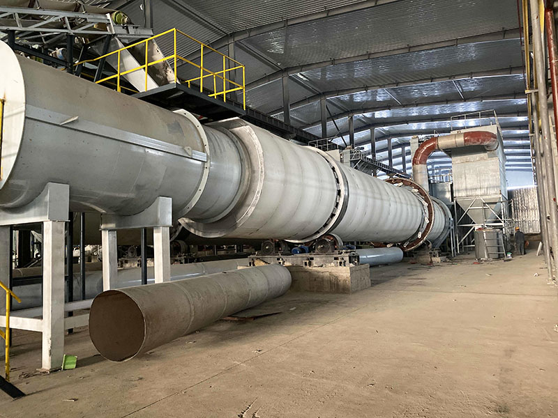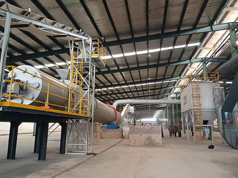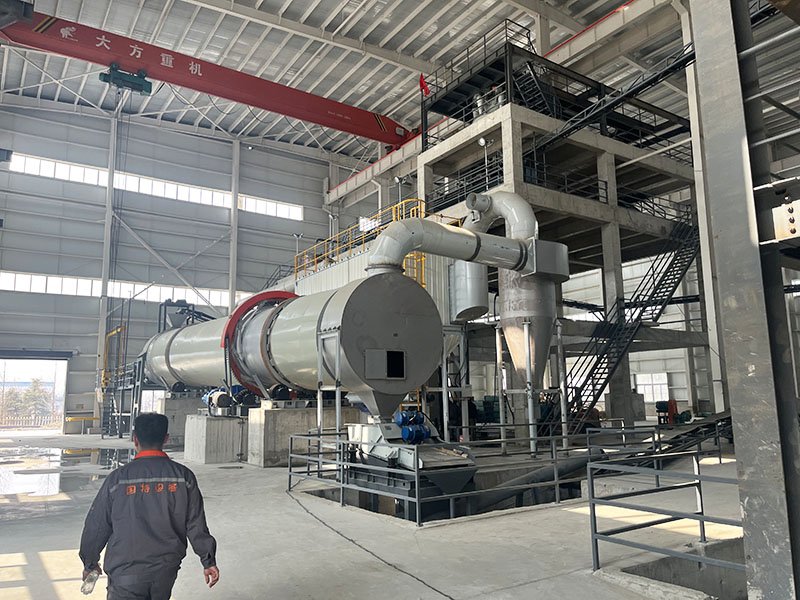 Working principle:Wet material is delivered to the hopper by a belt conveyor or bucket elevator. It then enters the hopper's feeder through a feeding pipe and into the feed end. The feeding pipe's slope should be greater than the material's natural inclination to ensure smooth material flow into the dryer. The dryer drum is a rotating drum slightly inclined to the horizontal. Material is fed at the higher end, while the heat carrier enters at the lower end, interacting with the material in countercurrent flow. Sometimes, the heat carrier and material flow together into the drum. Lifting plates are installed on the inner wall of the drum to lift and drop the material, increasing the contact surface between the material and the airflow, thereby increasing the drying rate and promoting material forward movement. The dried material falls onto the conveyor belt through the discharge port and is driven into the finished product warehouse.