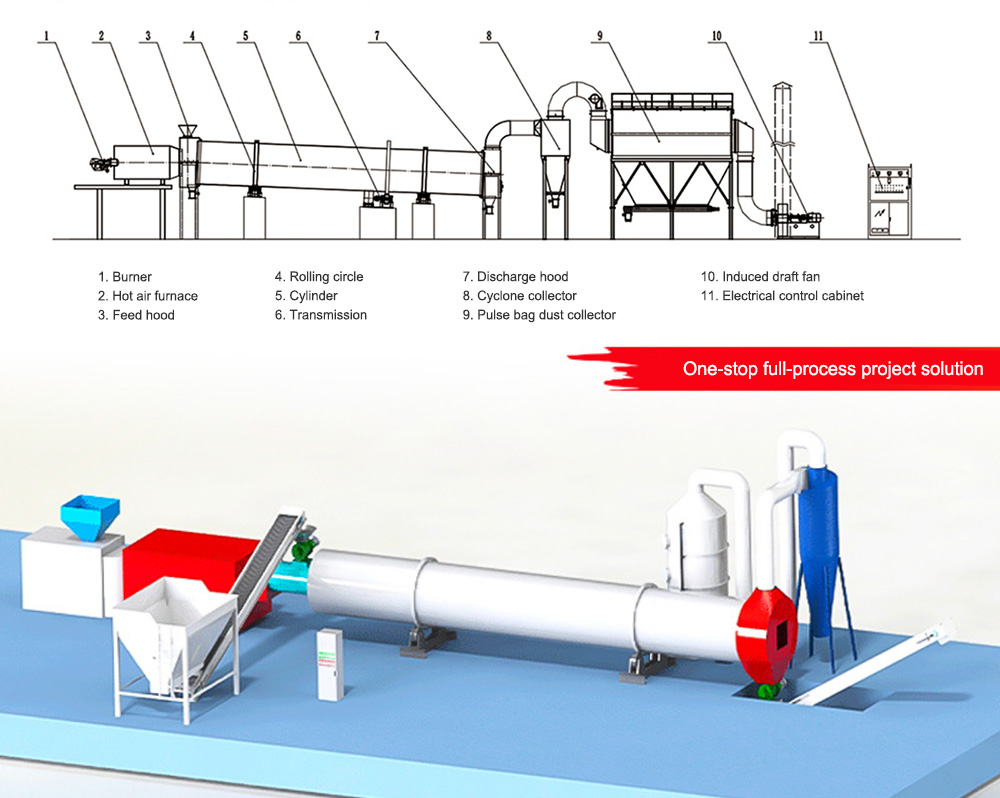 [Application Scenarios]:This core design focuses on optimizing thermal efficiency and material compatibility. It is widely used in industries such as mineral processing, building materials, metallurgy, and chemicals. Applications include: 1. Drying metal concentrates and tailings to improve subsequent sorting efficiency; 2. Processing blast furnace slag, cement raw materials, quartz sand, river sand, etc.; 3. Drying non-heat-sensitive materials such as bentonite and petroleum coke; 4. Drying coal slime, lignite, and biomass pellets for fuel production or tailings resource utilization.