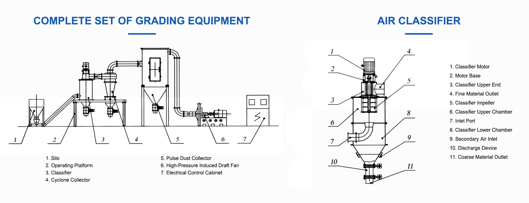 Introduction: The air classifier system consists of a feed control system, a classifier main unit, a cyclone collector, a pulse dust collector, and an induced draft fan. Its core innovation lies in forced vortex classification technology, which precisely controls the cut particle size by adjusting the impeller speed and air volume.