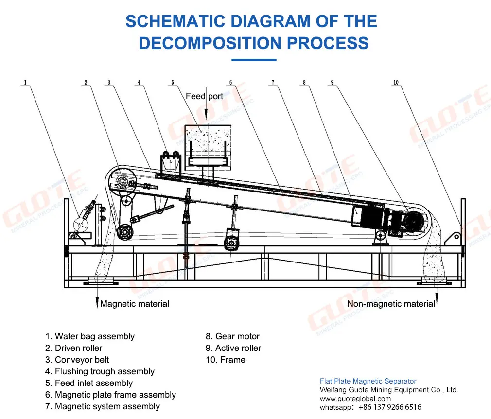 Working principle:The ore pulp enters the uniform distribution device of the wet belt magnetic separator through the feed pipe, and after being fully dispersed, it is evenly sprinkled on the belt on the upper part of the magnetic plate. Under the action of gravity, the pulp flows downward along the tilt direction of the magnetic plate. The magnetic substances contained in the pulp are firmly adsorbed on the belt under the strong magnetic field provided by the magnetic plate. The belt rotates along the tilt of the magnetic plate driven by the motor, and at the same time, the adsorbed magnetic substances are brought into the iron unloading area. The magnetic substances enter the magnetic material hopper under the flushing of the flushing water and are collected. The non-magnetic pulp continues to flow downward along the magnetic plate and flows into the non-magnetic material hopper to be collected.