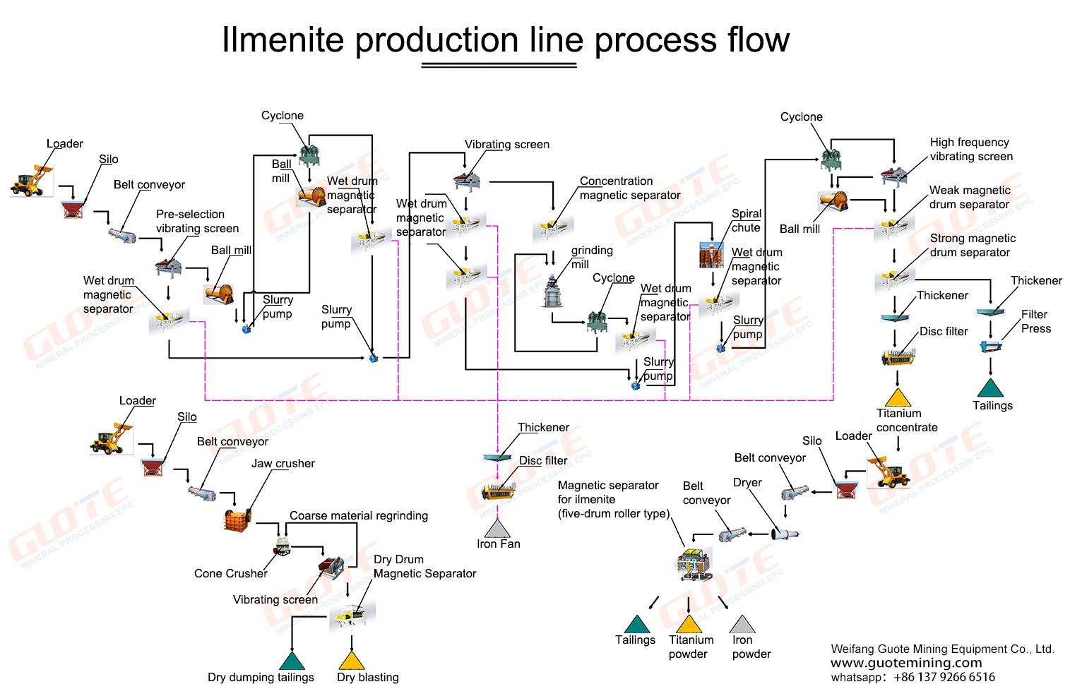 Ilmenite (mainly FeTiO₃) is the most important raw material for extracting titanium metal and manufacturing titanium dioxide (TiO₂). Its production line design and process flow are directly related to product quality, cost and resource utilization.