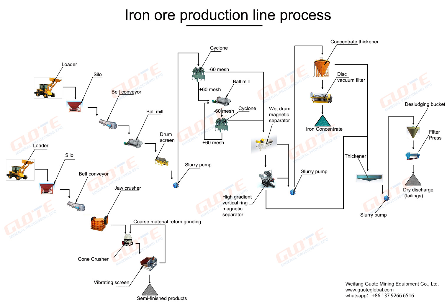 [Production line advantages]: Modern iron ore production lines are developing towards large-scale (single line 5 million tons/year), intelligent (5G+AI control), and zero emissions (tailings construction material utilization). The iron ore production line designed and constructed by Guote Mining Equipment saves more than 30% energy; new equipment such as high magnetic field wet drum magnetic separator and high gradient vertical ring magnetic separator can increase the concentrate grade by 1-2 percentage points.